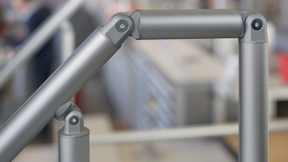 Pfosten und Handläufe realisieren Sie mit Profilen 8 D40. Diese sind mit einer oder zwei Nuten ausgestattet, die sauber und sicher verschlossen werden können. Als Knieleisten dienen Profile 6 D30 4N und als Trittleisten kommen Profile 8 120x16 E zum Einsatz. Die geltenden ISO-Vorschriften lassen sich auf diese Weise leicht erfüllen und sogar übertreffen. Dabei genügen fünf verschiedene Profilverbinder, um alle Verbindungsaufgaben sicher abzudecken. Bei einer Anpassung der Konstruktion können Sie vorhandene Bauteile problemlos wiederverwenden, sodass Sie deutlich weniger Einzelteile lagern müssen.