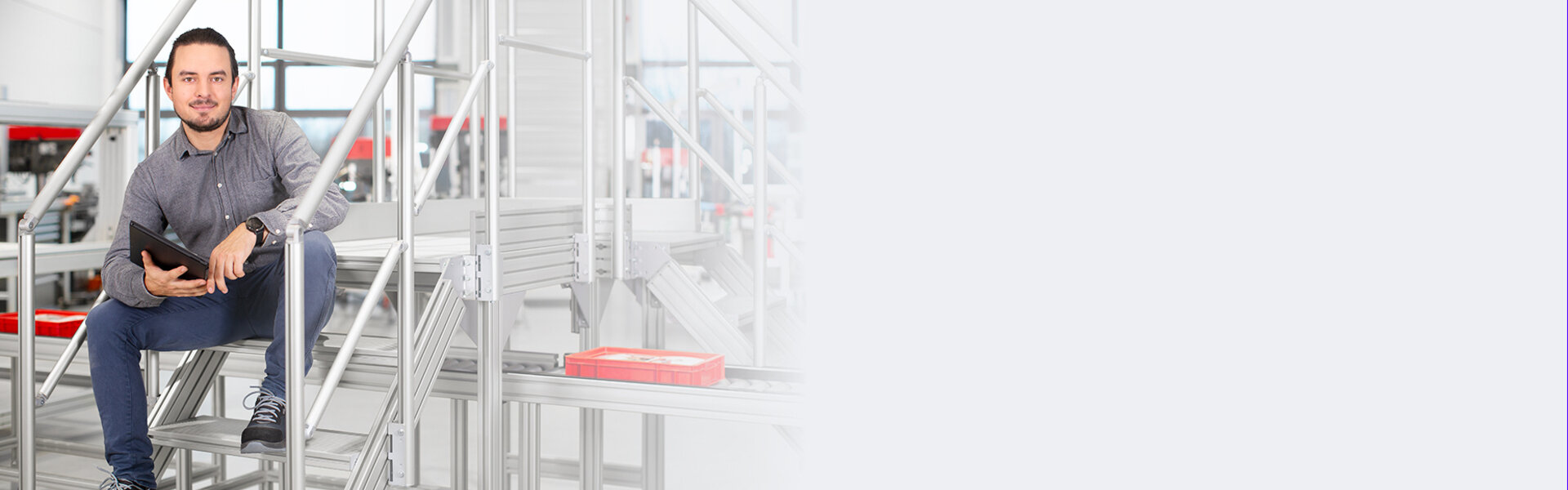 Das Treppen/Podeste System bietet normgerechte Sicherheit, ressourcenschonende Konstruktion und flexible Anpassungsmöglichkeiten. Realisieren Sie auf Basis des item Baukastenprinzips Maschinen- und Industrietreppen sowie Arbeitspodeste ganz nach Ihren individuellen Anforderungen.