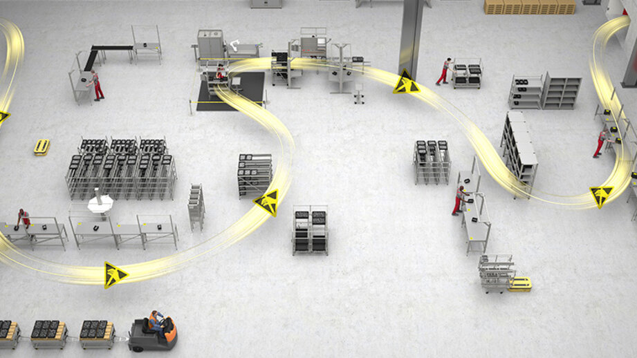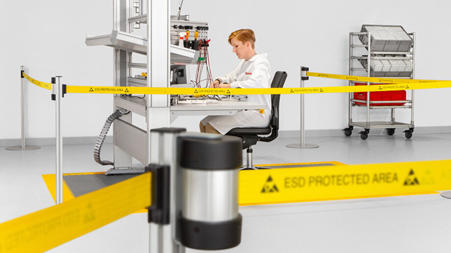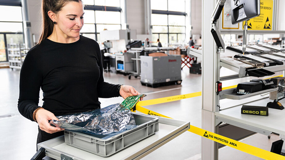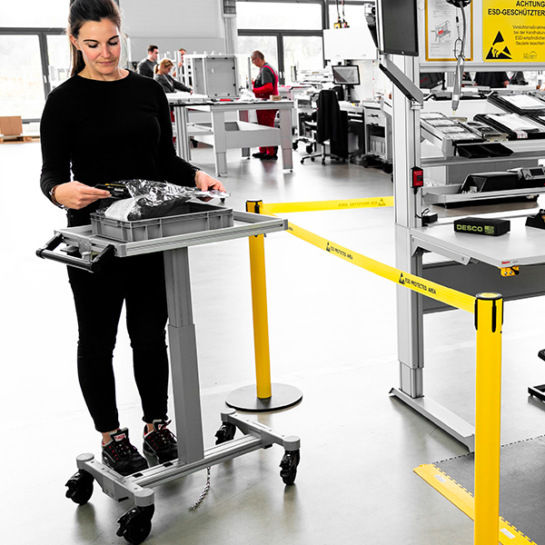 Whether during acceptance checks in incoming goods, transport, processing or packaging in the goods issue department, ESD can strike at any point in the process chain. Movement poses a particular challenge, which is why transport trolleys, tugger trains and conveyor belts should offer ESD protection.