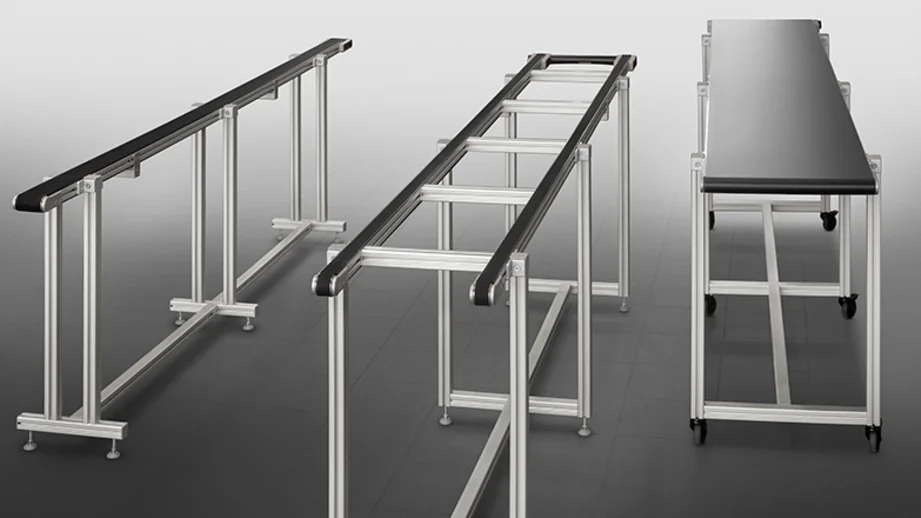 Thanks to a selection of ready-made stand designs, you can construct the ideal supports for single and double conveyor lines with ease. The modular design enables you to define heights and transitions to other systems with precision. This ensures your industrial conveyor belt will slot neatly into your working environment.