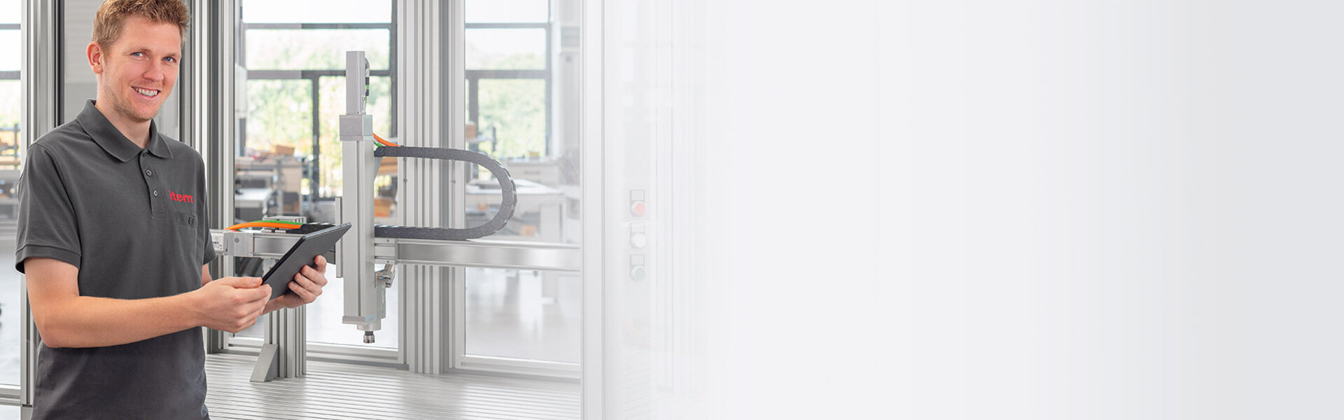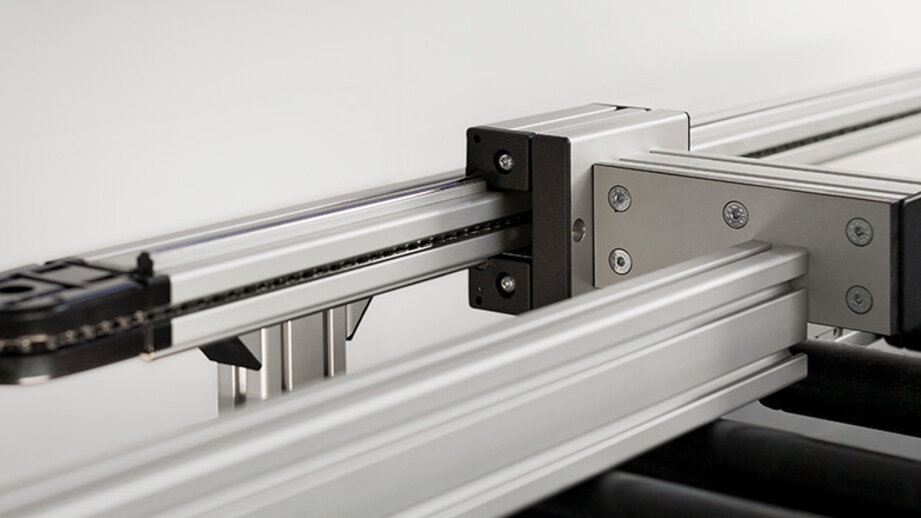 Grâce à l'utilisation de roues dentées, la force de la transmission par chaîne est convertie en un mouvement rotatif à chaque point de l'unité linéaire. Cet entraînement est donc idéal pour la construction de lignes de convoyage avec rouleaux de transport. Les portes relevables ou autres applications verticales peuvent également être réalisées avec un entraînement par chaîne.