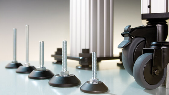 Grazie a piattelli inclinabili, i piedini regolabili in altezza in continuo compensano le irregolarità del pavimento. Le ruote di sollevamento coniugano mobilità e sicurezza di posizionamento. Entrambi si montano sulle piastre di base.